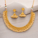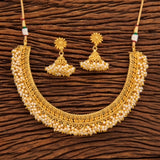 Embrace timeless elegance with this Antique Gold Necklace Set, a masterpiece of intricate craftsmanship. Adorned with lustrous pearls, this exquisite set features a traditional South Indian jewelry design that captures the essence of temple jewelry. The necklace comes with matching jhumkas, adding a regal touch to your festive or bridal attire. Perfect for weddings, celebrations, or special occasions, this set is a stunning representation of heritage and artistry. Elevate your style with this luxurious statement piece, embodying the rich culture of South Asian jewelry traditions.