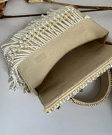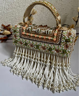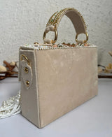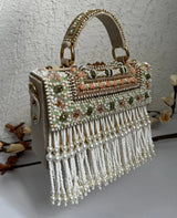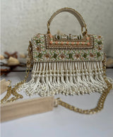 Introducing the Danika Flap Bag, a stunning fusion of bridal elegance and Indian craftsmanship. Hand-beaded with luxurious velvet in enchanting hues of mint, white, and peach, with a beautiful pearl motif, this bag embodies opulence and tradition. Its intricate design, coupled with delicate white suede accents, makes it a standout accessory for brides and lovers of Indian fashion alike. Whether for a wedding ceremony or a cultural celebration, the Danika Flap Bag adds a touch of regal charm to any outfit. Elevate your ensemble with the exquisite beauty of this Indian-inspired bridal bag.