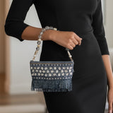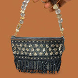 Add a touch of glamour to your look with this Grey Beaded Purse with Stone Work and Crystal Handle. Handcrafted with premium materials, this elegant clutch features intricate beadwork, sparkling high-quality stones, and a stunning beaded handle that exudes luxury. Perfect for weddings, parties, festive events, and evening occasions, this purse blends traditional craftsmanship with modern elegance. The grey tone adds a classy and versatile touch, making it easy to pair with ethnic outfits like sarees and lehengas or western gowns and dresses. Designed to hold your essentials in style, this handmade Indian clutch is ideal for those who love detailed artistry and statement accessories.