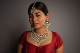 The Anaisha Kundan Necklace Set is an elegant and unique set featuring large High-Quality Kundan Stones, and turquoise beads with Gold-Plating.