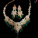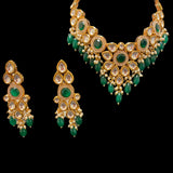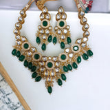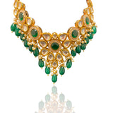 The Emerald Aayra Kundan Neckline Set features a beautiful combination of high quality Kundan, American Diamond, Emerald Beads and Pear. Set comes with a necklace and a pair of earrings. The center of the necklace has a beautiful flower motif with emerald monalisa bead in the center, surrounded by american diamonds. The flower petals are made of beautiful kundan. The back of the necklace and earrings have hand painted meenakari which gives a smooth fit.