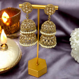 Elevate your ethnic jewelry collection with this exquisite double-layer Polki Jhumka in gold finish, crafted with high-quality Polki stones for a regal look. Featuring an intricate design, these traditional Indian jhumkas showcase two cascading layers of Polki stones, adding unmatched brilliance. The gold-plated finish enhances its luxurious appeal, making it perfect for weddings, festive occasions, and bridal wear. The delicate detailing and timeless craftsmanship make these Polki jhumkas a must-have for lovers of South Asian jewelry. Pair them with lehengas or sarees for a statement look. Shop now for the perfect Polki earrings!