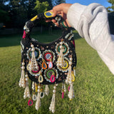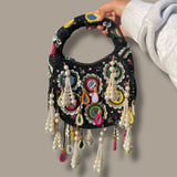 Make a bold statement with this handcrafted black beaded bag adorned with intricate mirror work, multicolor thread embroidery, and pearl tassels. Perfect for Indian weddings, festive events, and bridal occasions, this ethnic clutch combines elegance and tradition. The beaded handle adds a luxe touch, while the vibrant accents complement any lehenga or saree. Designed to hold your essentials in style, this potli is a must-have for your desi wardrobe. Ideal for brides, bridesmaids, or anyone seeking a stunning traditional accessory. Elevate your look with this eye-catching Indian handbag, crafted for celebrations and cultural events.