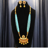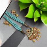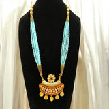 This exquisite sky blue long necklace set brings together Kundan, meenakari, and delicate pearls for a timeless look. Featuring strands of soft blue beads, gold plating, and intricate Kundan work, this necklace captures the essence of traditional Indian jewelry with a fresh, elegant twist. Perfect for weddings, festivals, or any grand occasion, the set comes with matching earrings to complete the look. The classic blend of pearls and gold-plated details alongside rich meenakari artistry makes this South Asian jewelry set a refined choice for any collection, adding grace and sophistication to any outfit.