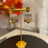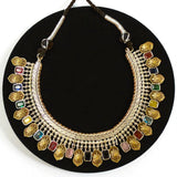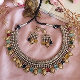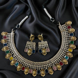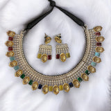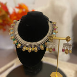 Elevate your style with this stunning dual-tone multicolor silver necklace set, a perfect blend of elegance and vibrancy. Crafted with intricate detail, this necklace features a harmonious mix of gold and silver finishes, adorned with vibrant multicolor beads that add a splash of color to any outfit. Whether you're dressing up for a special occasion or adding a touch of glamour to your everyday look, this silver necklace set is the perfect accessory. Embrace the fusion of traditional charm and contemporary design with this exquisite piece, ideal for South Asian jewelry lovers seeking versatility and flair.