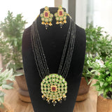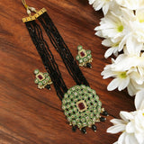 Adorn yourself in elegance with this exquisite black beads long necklace set, designed to reflect the timeless artistry of South Asian jewelry. Each strand of lustrous black beads is beautifully complemented by intricate meenakari detailing, dazzling Kundan stones, and rich ruby accents, creating a stunning piece that exudes tradition and sophistication. Perfect for weddings, festive occasions, or any grand event, this set effortlessly blends classic charm with vibrant allure, making it an ideal addition to any jewelry collection. Add a touch of tradition with this breathtaking statement piece that captures the essence of South Asian heritage.