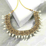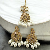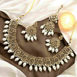Elevate your ethnic look with the Tina Polki Necklace Set with Earrings and Maang Tikka, a perfect choice for wedding jewelry, bridal wear, and festive occasions. This traditional Indian jewelry set features handcrafted Polki stones set in antique Mehndi gold plating, accented with luxurious white pearls for a royal finish. The set includes a statement choker necklace, dangling earrings, and a matching maang tikka, making it ideal for lehenga, saree, or bridal outfits. Whether you're attending a haldi, sangeet, or Diwali party, this designer Polki jewelry set will add elegance and timeless charm to your ensemble.