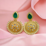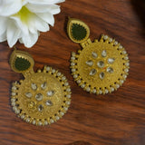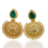 Discover the allure of our Gold Kundan Earrings, a perfect blend of tradition and style. These earrings feature embedded Kundan for a touch of classic charm, while pearls on the outer layer add sophistication. The star of the show is the vibrant Emerald Amrapali stone, symbolizing prosperity.