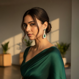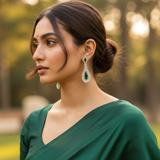 These high-quality AD emerald earrings are a stunning blend of luxury, elegance, and craftsmanship—perfect for weddings, parties, and festive occasions. Designed with sparkling cubic zirconia and a rich emerald-green stone, these long teardrop earrings add a glamorous touch to any outfit. The intricate AD work creates a radiant shine, while the delicate floral center detail gives them a refined, designer look. Lightweight and comfortable for all-day wear, these earrings pair beautifully with lehengas, sarees, gowns, and Indo-Western outfits. Ideal for brides, bridesmaids, and anyone looking for premium Indian jewelry, these emerald AD earrings make a timeless statement. Whether you're shopping for special events, South Asian functions, or gifting, this elegant CZ and emerald earring set offers unmatched sparkle and sophistication. A must-have addition to your jewelry collection and perfect for elevating any festive or wedding ensemble.