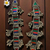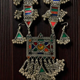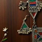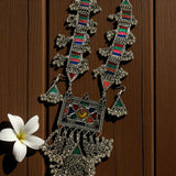 Make a bold statement with this exquisite German Silver Multicolor Ghungroo Necklace, a masterpiece of traditional craftsmanship and ethnic charm. This long statement necklace features intricate oxidized silver detailing with vibrant red, green, and blue enamel work, giving it a rich tribal and bohemian allure. The necklace is beautifully adorned with delicate ghungroo chains that add graceful movement and sound with every step.