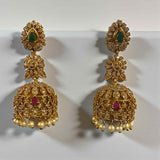 These stunning Gold Jhumka Earrings showcase timeless elegance with a blend of Cubic Zirconia (CZ), Ruby, and Emerald stones. Crafted in a traditional design, the earrings feature intricate detailing and a rich gold finish that captures the essence of South Asian artistry. The top portion highlights a teardrop emerald stone surrounded by sparkling CZs, while the dome-shaped jhumka is adorned with a ruby centerpiece and shimmering CZ accents.