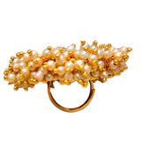 Elevate your elegance with our exquisite Rahela Poliki Adjustable Ring With Pearls, a fusion of traditional charm and contemporary allure. Crafted with precision and passion, this ring features a centerpiece of high-quality Polki, reflecting timeless South Asian craftsmanship. Surrounding the Polki are lustrous cluster pearls, each meticulously chosen to enhance the ring's opulence.