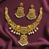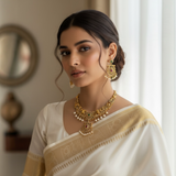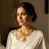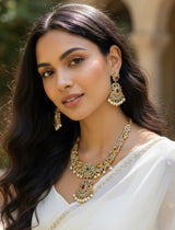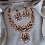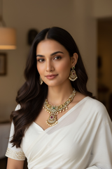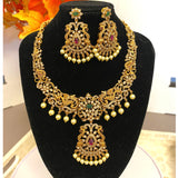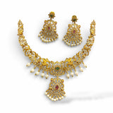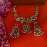 Add a touch of elegance to your collection with this beautiful gold-plated necklace set. Designed with care, it features a stunning mix of American diamonds, ruby, and emerald stones, all brought together with delicate pearls. This set isn't just jewelry; it's a statement piece perfect for weddings, festive events, or any occasion where you want to shine. The intricate design captures the essence of traditional South Asian craftsmanship while offering a modern twist. Whether you're dressing up or gifting someone special, this necklace set is sure to impress.