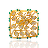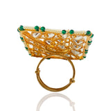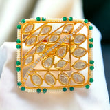 Elevate your ethnic ensemble with our Emerald Ishita Adjustable Kundan Ring, a stunning embodiment of Indian jewelry craftsmanship. Crafted to perfection, this rectangular ring boasts emerald beads and silver foil Kundan, exuding timeless elegance. The intricate design is accentuated with delicate rice pearls adorning the edges, adding a touch of traditional charm. At the heart of the ring lies a captivating line of AAA quality American diamonds, radiating brilliance with every movement. Versatile and adjustable, it effortlessly complements any finger size, making it a must-have addition to your jewelry collection. Embrace the allure of Kundan rings and make a statement of refined sophistication with our Emerald Ishita Adjustable Kundan Ring.