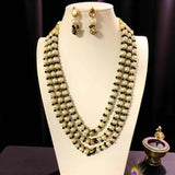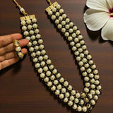 Introducing the Fatiha Long Pearl Necklace with Earrings and Black Beads, Kundan & Meenakari on Gold Plating—a stunning handcrafted Indian mala designed for weddings, festivals, and cultural celebrations. This luxurious long necklace features premium pearls paired with classic black beads, creating a rich and eye-catching contrast. Intricate Kundan work and vibrant Meenakari detailing on gold plating add a regal, heritage-inspired finish that stands out beautifully in bridal and festive attire.