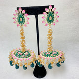 The exquisite and unique Emerald Nashira Jhumka are the perfect jhumkas for both party wear. This beautiful drop jhumka features dangling pearls, Emerald beads, Hand-painted Meenakari, and high-quality kundan on Gold-Plating.