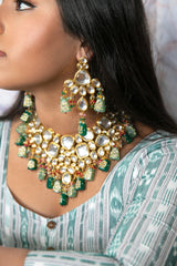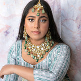 The Mahika Bridal Kundan Necklace Set is a handmade beauty. With its name meaning "earth" in Sanskrit this divine piece lives up to all expectations. Consisting of hand painted back meenakari, premium quality kundan, and mint and emerald handpainted Tanjore beads this lovely set is a must have in everyone's jewelry collection.