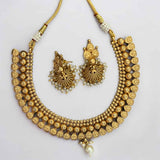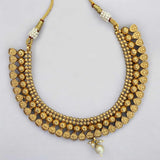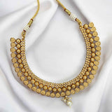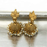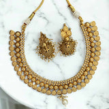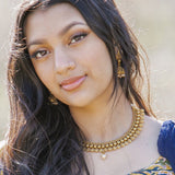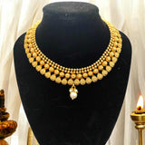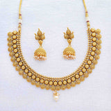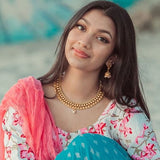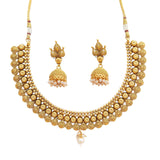 Elevate your ethnic look with this exquisite gold-plated necklace set featuring classic pearl detailing and matching jhumka earrings. Designed to reflect traditional Indian craftsmanship, this elegant necklace showcases intricate patterns and lustrous pearls, perfect for weddings, festivals, and special occasions. The statement jhumka earrings complement the set beautifully, adding timeless charm to any outfit. Whether styled with a saree or lehenga, this gold necklace with pearls and jhumkas is a must-have in your jewelry collection.