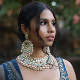 The Pink Mona Kundan Necklace Set is an elegant and unique set featuring High-Quality Kundan on Gold-Plating with a stunning pairing of pink and firozi hydro-beads.