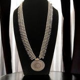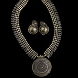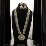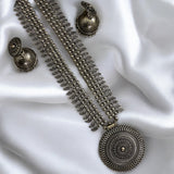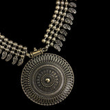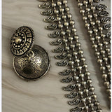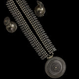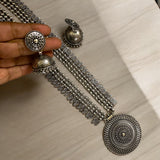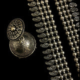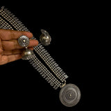 This stunning long oxidized necklace set brings a touch of traditional elegance with its intricate round pendant design. Paired with beautifully crafted jhumkas, this set captures the timeless allure of Indian jewelry, making it perfect for festive occasions or as an everyday statement piece. The dark, oxidized finish enhances its vintage charm, while the detailed artistry of both the pendant and earrings adds depth and sophistication. Ideal for anyone seeking a unique touch in South Asian jewelry, this necklace set is a versatile addition to any collection, blending heritage with style effortlessly.At Romikas, we pride ourselves on the craftsmanship and high quality of our jewelry, designed to enhance your natural beauty. Please contact us with any questions.