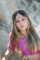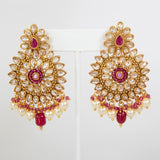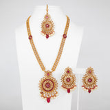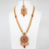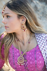 The Ruby Parul Jewelry Set showcases high-quality Kundan and Polki Stones on gold-plating. This mesmerizing design will dazzle this festive season.