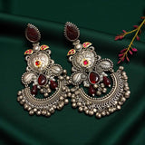 Add a touch of bold elegance to your look with these stunning oxidized silver long chandbali earrings featuring vibrant ruby carved stones. Intricately crafted with detailed filigree work and finished with playful ghungroos, these earrings exude traditional charm with a contemporary twist. The rich ruby red stones stand out beautifully against the antique silver finish, making them perfect for weddings, festive occasions, or styling with Indo-western outfits. Lightweight and eye-catching, these earrings are a must-have for lovers of heritage jewelry with a modern flair.