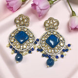 Elevate your traditional look with this exquisite Blue Kundan and CZ Long Necklace Set, crafted with precision and elegance. The necklace features four layers of rich blue beads that beautifully complement the statement pendant adorned with high-quality Kundan, sparkling cubic zirconia (CZ), and delicate pearls. The pendant’s intricate detailing and silver foiling at the back add a luxurious finish and ensure lasting brilliance.