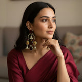 These elegant 925 silver-plated ruby chandbali earrings with jhumkas are a stunning blend of traditional Indian artistry and modern style, making them the perfect accessory for weddings, festivals, and special occasions. Featuring rich ruby stones, intricate floral details, and beautifully crafted jhumka drops with pearl accents, these earrings offer a regal, eye-catching look that complements sarees, lehengas, anarkalis, and Indo-Western outfits. The dual-tone silver and gold finish enhances their versatility, while the lightweight design ensures comfortable wear throughout long celebrations. Ideal for brides, bridesmaids, and anyone who loves statement jewelry, these ruby chandbali jhumka earrings add elegance and charm to any festive ensemble. They also make a thoughtful gift for birthdays, anniversaries, bridal showers, and holiday celebrations. Add these timeless, premium-quality earrings to your jewelry collection and enjoy a luxurious piece that showcases exquisite craftsmanship and strong Indian ethnic jewelry appeal.