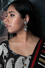 Our unique Gaja jhumka earrings feature an intricate elephant design on oxidized silver. Handcrafted with care, these jhumkas make a delightful statement.