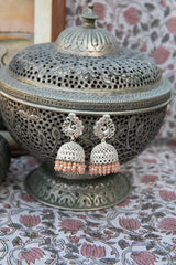 Complement your outfits with our cute and lightweight peach Mayuri jhumka, handcrafted with peach-colored beads and crystals set in silver.