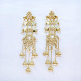 The stunning polki work, adds a touch of regal splendor, making these earrings perfect for weddings, festivals, and special occasions. The hanging jhumkas, with their intricate design and delicate movement, bring a graceful charm to your look, ensuring you stand out with every wear.